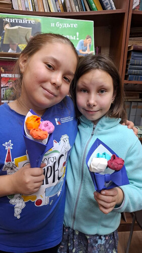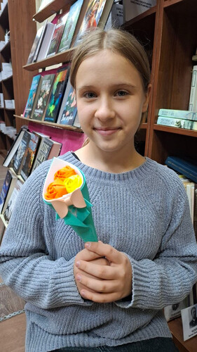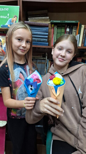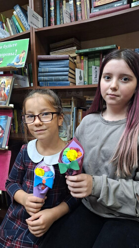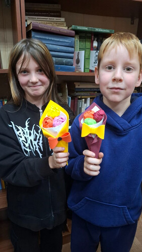 Но наши участники мастер-класса очень старались, вкладывая частичку души в такой простой, но очень важный подарок. Затем наполнили кулечки конфетками и закрепили цветы в букет. У каждого получился свой неповторимый подарок. |
